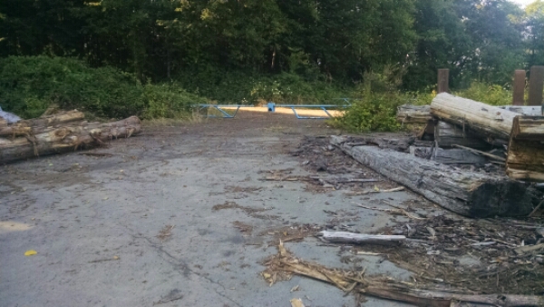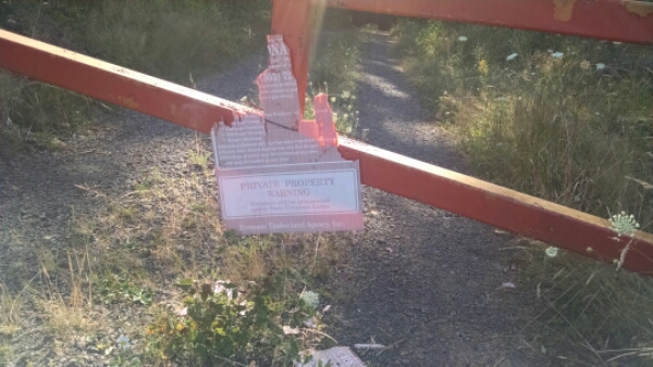 About a quarter mile past the other side, I come to this nearly empty logging lot. It stretches out like three or four football fields together in a square. And google is telling me to follow some imaginary road right through the middle of the thing. This is obviously private property at this point, and I’m thoroughly confused and disoriented. So I back track about a quarter mile, then return and wander aimlessly around the lot trying to find another road. Finally, after reaching the far side and tracing the border, I come to the gate pictured below. It was seriously hard to find.